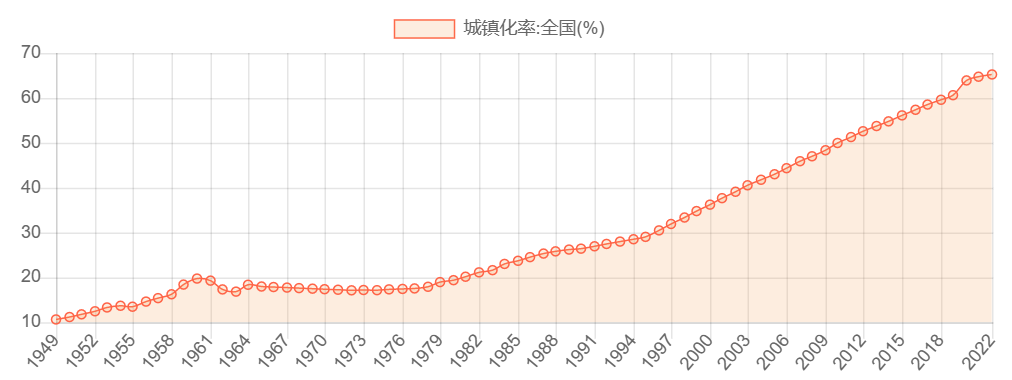 當(dāng)然是我們的城鎮(zhèn)化,我們的城鎮(zhèn)化指數(shù),從1998年的33.35%增長(zhǎng)到的2022年65.22%,翻倍了。