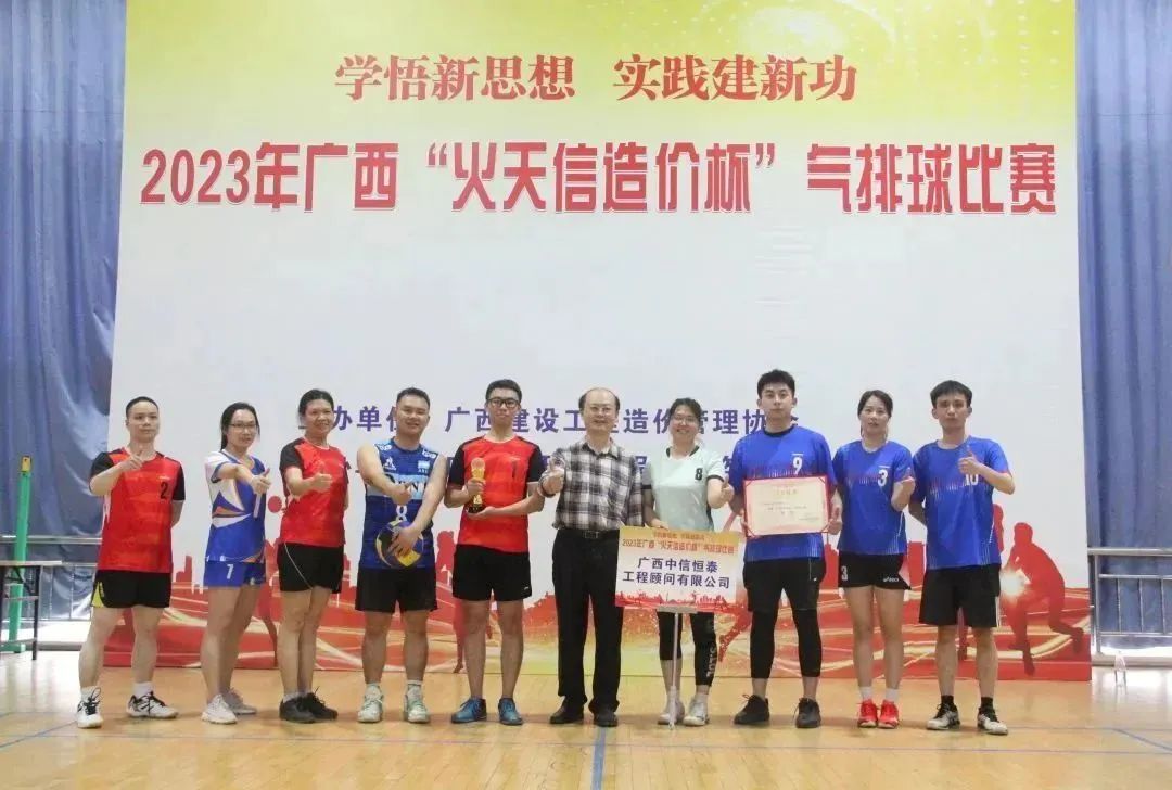 5月14日下午,由廣西建設(shè)工程造價(jià)管理協(xié)會(huì)主辦的2023年廣西“火天信造價(jià)杯”氣排球比賽在南寧市體育場落下帷幕。經(jīng)過兩天激烈的角逐,中信恒泰代表隊(duì)力克群雄,勇奪本次比賽冠軍。