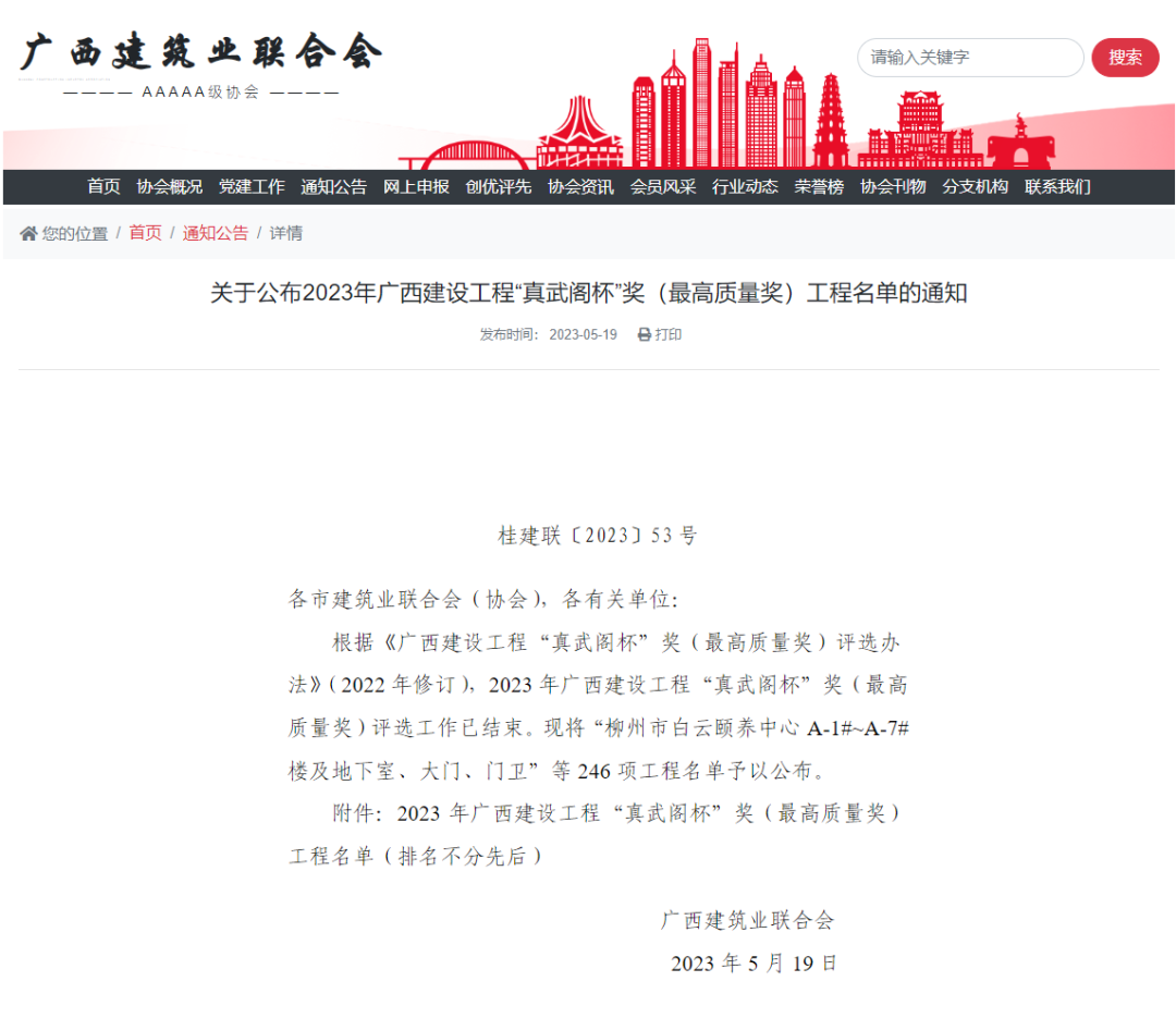 匠心贏贊譽(yù),品質(zhì)樹標(biāo)桿。近日,廣西建筑業(yè)聯(lián)合會(huì)發(fā)布《關(guān)于公布2023年廣西建設(shè)工程“真武閣杯”獎(jiǎng)(最高質(zhì)量獎(jiǎng))工程名單的通知》,中信恒泰13個(gè)項(xiàng)目榜上有名。