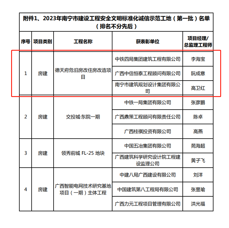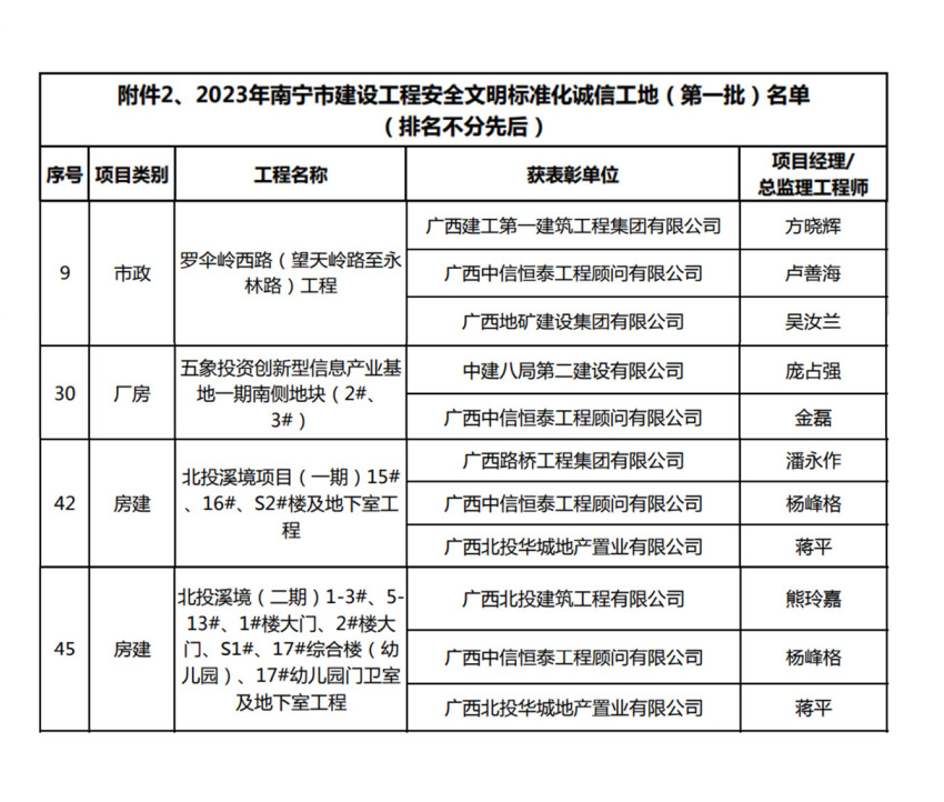 6月6日,南寧市建設工程質量安全協(xié)會公布了2023年南寧市建設工程安全文明標準化誠信示范工地(第一批)及2023年南寧市建設工程安全文明標準化誠信工地(第一批)名單,中信恒泰5個項目榜上有名。