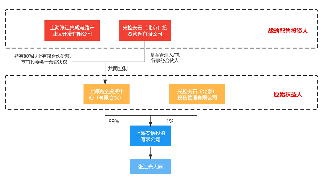 在國內(nèi)首單通過“Pre-REITs+公募REITs”退出的張江光大園公募REITs項目中,上海張江集成電路產(chǎn)業(yè)區(qū)開發(fā)有限公司(以下簡稱“張江集電”)因持有東上海光全投資中心(有限合伙)(以下簡稱“光全投資”)80%以上的合伙企業(yè)份額且享有投委會一票否決權,被認定為能夠與基金管理人/執(zhí)行事務合伙人光控安石(北京)投資管理有限公司(以下簡稱“光控安石”)共同控制光全投資,進而認定由張江集電、光控安石作為戰(zhàn)略配售投資人的安排符合公募REITs的發(fā)行條件。