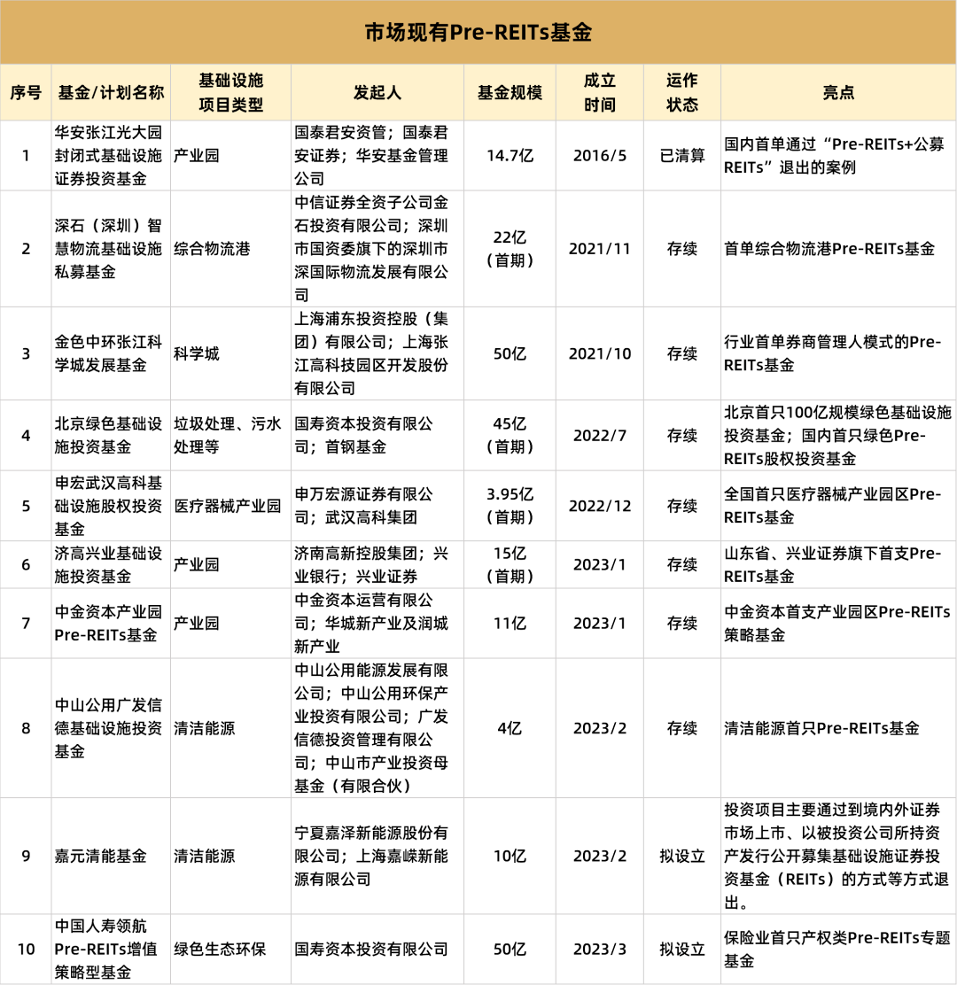 目前全球不動產(chǎn)私募基金總規(guī)模已超過1萬億美元,且近年來保持高速增長趨勢。從全球不動產(chǎn)私募基金分布來看,北美和歐洲的規(guī)模合計占比近90%,而亞洲地區(qū)不動產(chǎn)私募基金僅占10%左右。根據(jù)中國證券投資基金業(yè)協(xié)會數(shù)據(jù)顯示,截至2022年末,協(xié)會存續(xù)私募股權房地產(chǎn)基金838只,存續(xù)規(guī)模4043億元,存續(xù)私募股權基礎設施基金1424只,存續(xù)規(guī)模1.21萬億元,主要投向商業(yè)地產(chǎn)、交通基礎設施、物流倉儲、市政工程開發(fā)與建設等。根據(jù)對公開資料的不完全統(tǒng)計,目前市場上已設立或計劃設立的Pre-REITs基金已有10只,分別如下表列示: