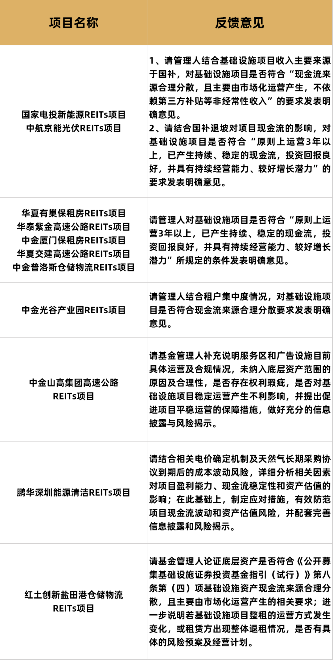 經(jīng)統(tǒng)計已發(fā)行公募REITs項目反饋意見,涉及基礎設施項目現(xiàn)金流的監(jiān)管反饋主要有: