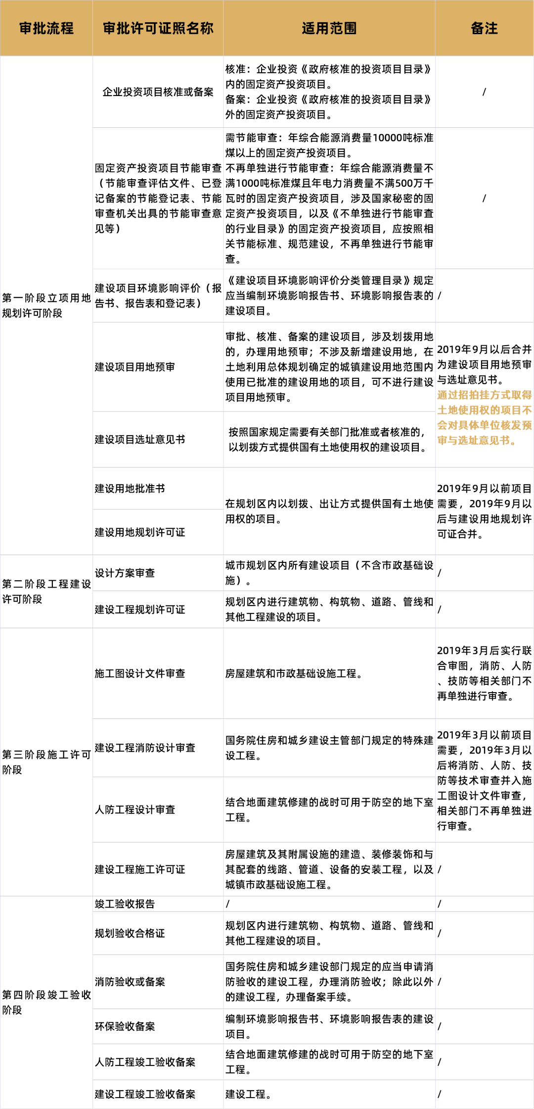 根據(jù)滬深交易所分別制定的《公開募集基礎設施證券投資基金(REITs)規(guī)則適用指引第1號——審核關注事項(試行)(2023年修訂)》,基礎設施項目應當符合下列條件:基礎設施資產(chǎn)已通過竣工驗收,工程建設質(zhì)量和安全標準符合相關要求,原則上已按照投資建設時的規(guī)定履行規(guī)劃、用地、環(huán)評等審批、核準、備案、登記以及其他依據(jù)法律法規(guī)應當辦理的手續(xù)?;A設施項目建設合規(guī)性的判斷依據(jù)乃投資建設時的法律法規(guī),而我國工程建設項目審批制度在深化改革的大背景下亦在不斷改革和優(yōu)化,《國務院辦公廳關于全面開展工程建設項目審批制度改革的實施意見》(國辦發(fā)〔2019〕11號)將工程建設項目審批流程主要劃分為立項用地規(guī)劃許可、工程建設許可、施工許可、竣工驗收四個階段,實行聯(lián)合審圖和聯(lián)合驗收。該制度對既有工程建設項目審批流程進行了總結(jié),同時按此四個階段對審批流程進行了一定的優(yōu)化。以2019年為劃分時點,可以按此四個階段對基礎設施項目國有建設用地及建設所需獲得的審批整理如下: