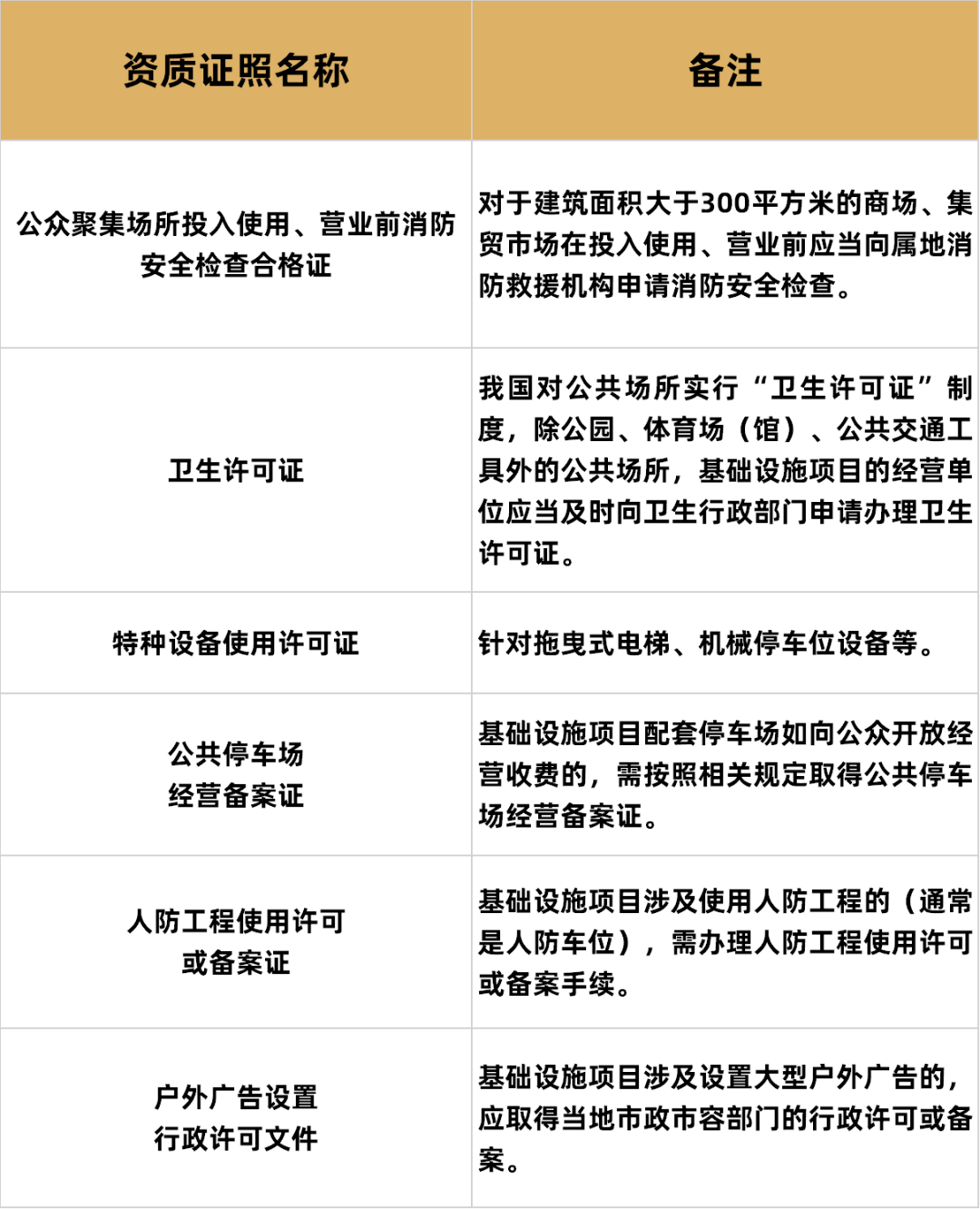 滬深交易所《公開募集基礎設施證券投資基金(REITs)規(guī)則適用指引第1號——審核關注事項(試行)(2023年修訂)》中要求基礎設施資產(chǎn)涉及經(jīng)營資質(zhì)的,相關經(jīng)營資質(zhì)或者經(jīng)營許可應當合法、有效。不同基礎設施項目的經(jīng)營資質(zhì)差異較大,以消費基礎設施為例,項目公司運營消費基礎設施項目需要取得的相關資質(zhì)或許可主要有:
