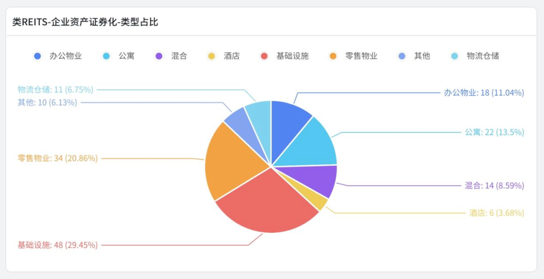 截至2023年4月23日,在已發(fā)行的173只類REITs中,底層資產(chǎn)類型包括基礎設施(50只)、酒店(6只)、公寓(24只)、辦公物業(yè)(18只)、零售物業(yè)(34只)、物流倉儲(11只)以及其他(10只)。