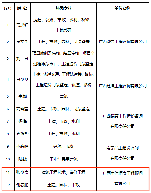 近日,南寧市建設(shè)工程造價(jià)和招投標(biāo)行業(yè)協(xié)會(huì)發(fā)布《關(guān)于發(fā)布南寧市建設(shè)工程造價(jià)和招投標(biāo)行業(yè)協(xié)會(huì)專家名單的通知》,廣西中信恒泰工程顧問有限公司專業(yè)技術(shù)人員張少貴、謝春鵬、蔣文彬、龐梅等4人成功入庫。