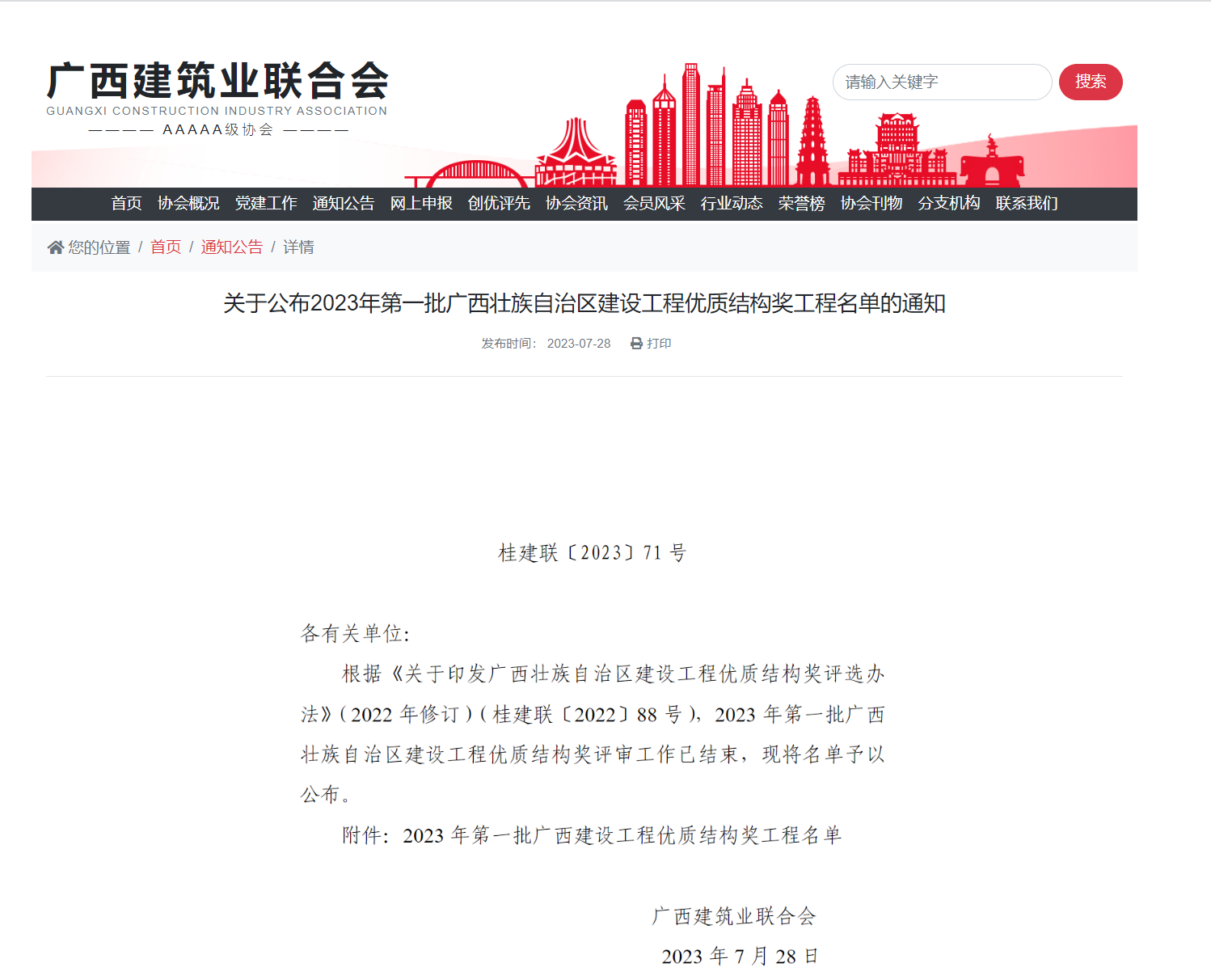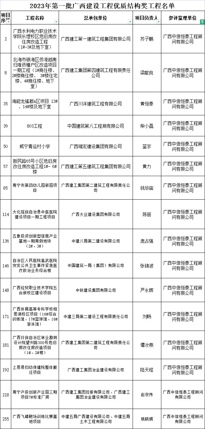 近日,廣西建筑業(yè)聯(lián)合會公布了2023年第一批廣西壯族自治區(qū)建設(shè)工程優(yōu)質(zhì)結(jié)構(gòu)獎工程名單,由廣西中信恒泰工程顧問有限公司監(jiān)理的16個項目榮獲2023年第一批廣西壯族自治區(qū)建設(shè)工程優(yōu)質(zhì)結(jié)構(gòu)獎。