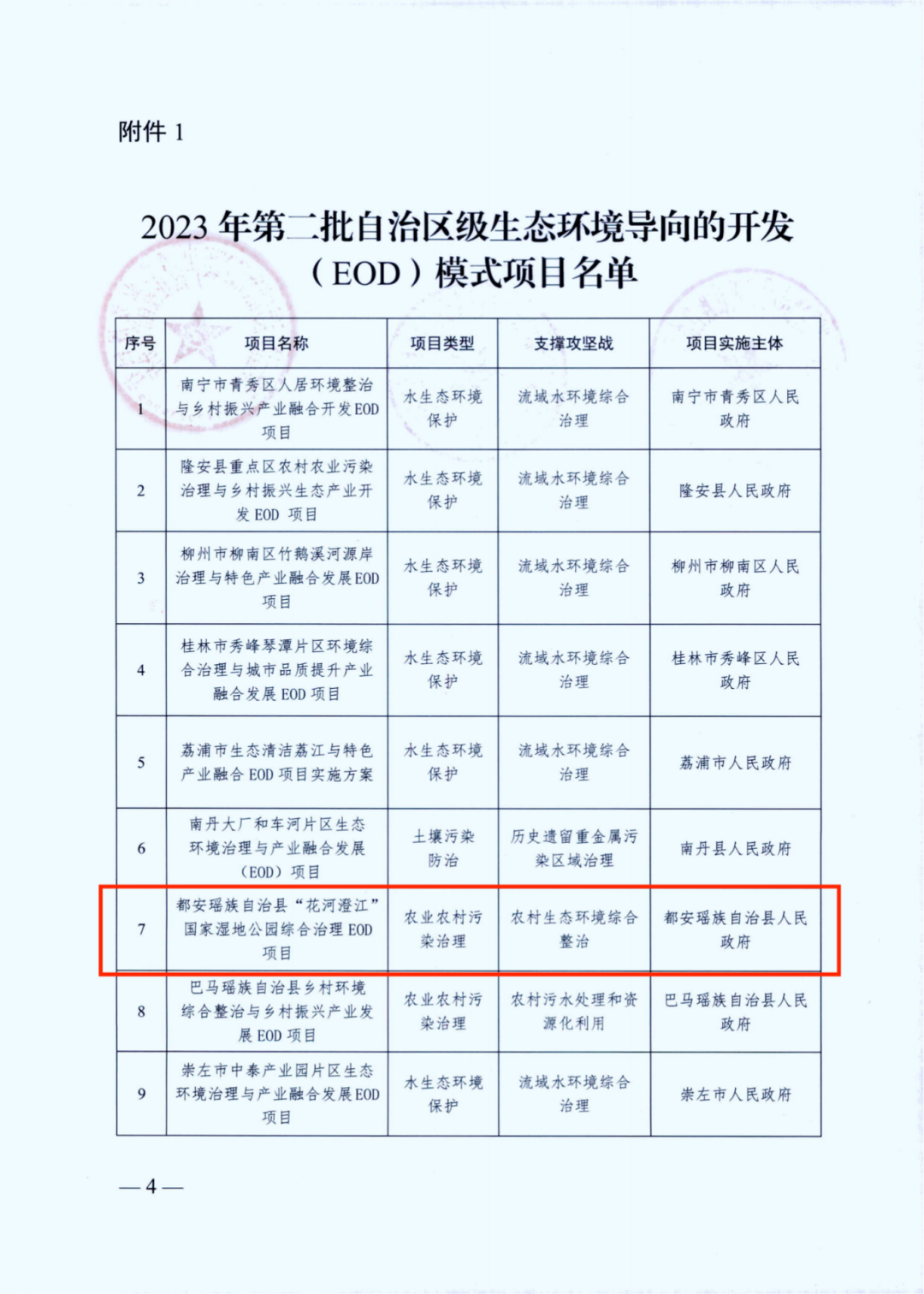 近日,廣西壯族自治區(qū)生態(tài)環(huán)境廳、國家開發(fā)銀行廣西分行和農(nóng)業(yè)發(fā)展銀行廣西分行聯(lián)合印發(fā)《關于同意開展2023年第二批自治區(qū)級生態(tài)環(huán)境導向的開發(fā)(EOD)模式試點工作的通知》,公布9個自治區(qū)級EOD入庫項目,由中信恒泰包裝策劃的都安瑤族自治縣“花河澄江”國家濕地公園綜合治理EOD項目成功入庫。