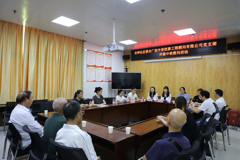 黨建引領(lǐng)聚合力,月圓濃情暖中秋。9月22日,中信恒泰黨支部書記甘江幸、副總經(jīng)理郭佳鑫、公司黨員代表及“藍(lán)絲帶”公益活動(dòng)小組一同到吉祥社區(qū)開(kāi)展中秋慰問(wèn)活動(dòng),為生活困難的黨員和群眾送上關(guān)懷與慰問(wèn)。