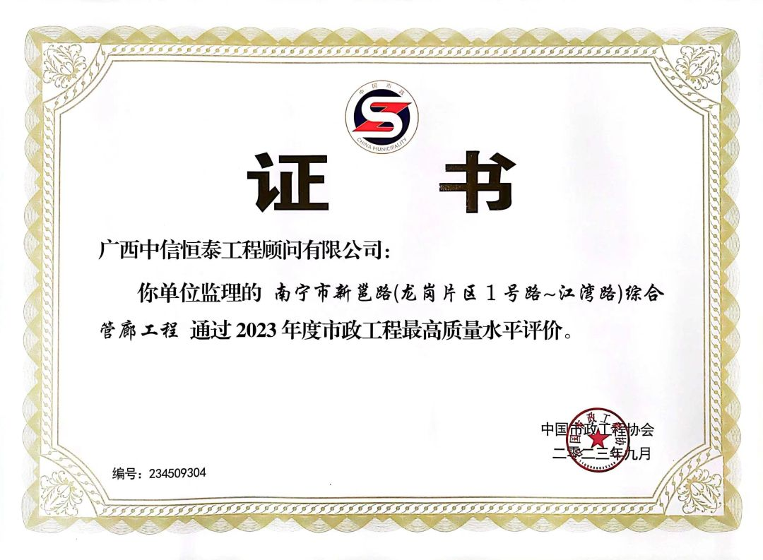 近日,中國(guó)市政工程協(xié)會(huì)公布2023年通過(guò)市政工程最高質(zhì)量水平評(píng)價(jià)工程名單,由中信恒泰監(jiān)理的南寧市新邕路(龍崗片區(qū)1號(hào)路~江灣路)綜合管廊工程榮獲2023年度市政工程最高質(zhì)量水平評(píng)價(jià)(原全國(guó)市政金杯示范工程獎(jiǎng))。公司項(xiàng)目已連續(xù)2年榮獲全國(guó)市政工程最高質(zhì)量水平評(píng)價(jià),充分彰顯了行業(yè)對(duì)中信恒泰專(zhuān)業(yè)技術(shù)實(shí)力和服務(wù)水平的高度肯定。