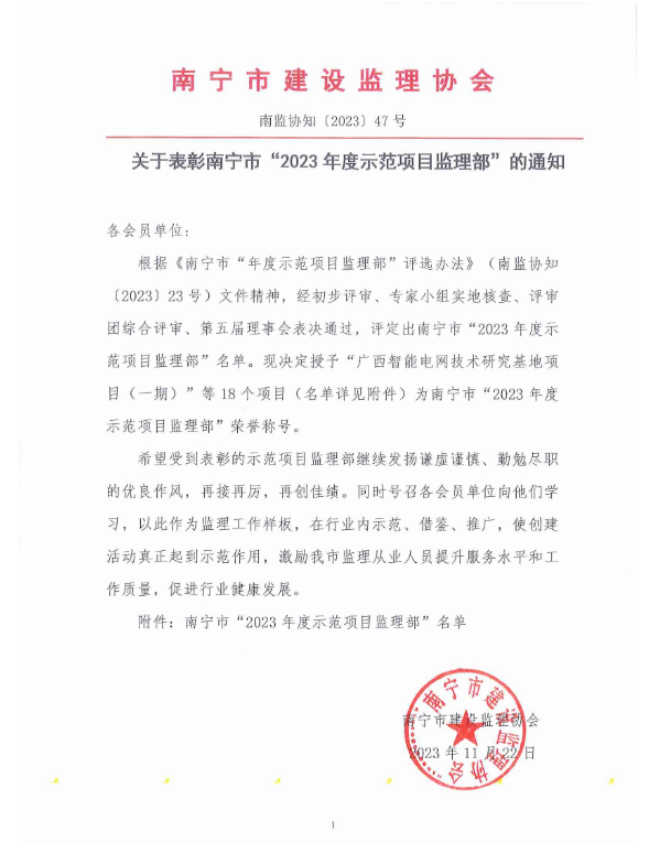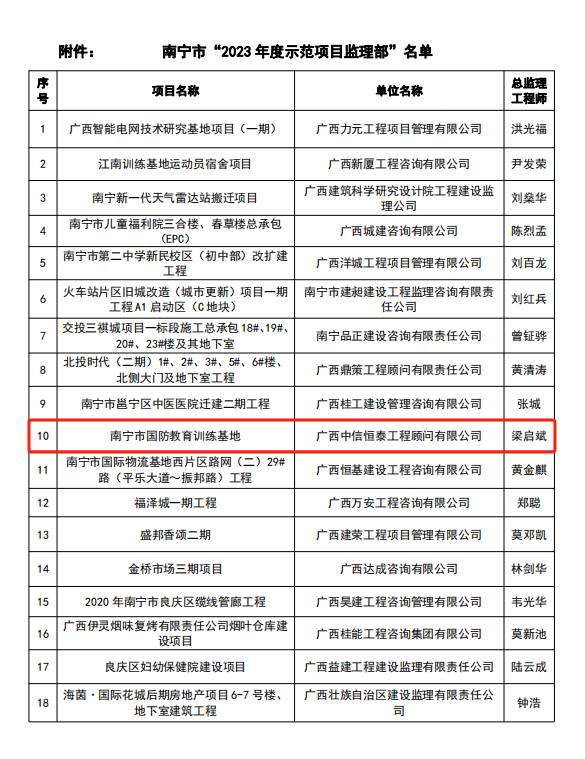 近日,南寧市建設(shè)監(jiān)理協(xié)會公布2023年度示范項(xiàng)目監(jiān)理部名單,由中信恒泰監(jiān)理的南寧市國防教育訓(xùn)練基地項(xiàng)目榮獲南寧市“2023年度示范項(xiàng)目監(jiān)理部”稱號。此次榮譽(yù)的獲得,是行業(yè)對中信恒泰服務(wù)質(zhì)量和服務(wù)水平的充分肯定,有力彰顯了公司良好的企業(yè)形象和行業(yè)信譽(yù)。