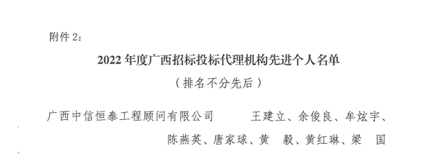 12月25日,廣西建筑業(yè)聯(lián)合會招標投標分會召開第二屆第五次會員代表大會,會上表彰了2022年度廣西招標投標行業(yè)先進單位和先進個人。中信恒泰榮獲“2022年度廣西招標投標行業(yè)先進單位”稱號,公司8人獲評“2022年度廣西招標投標行業(yè)先進個人”。