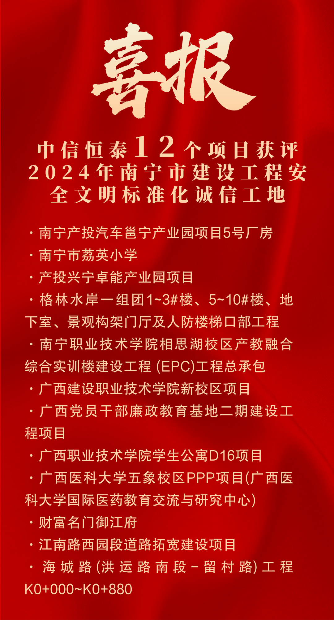 ◎喜訊 | 中信恒泰12個(gè)項(xiàng)目獲評(píng)2024年南寧市建設(shè)工程安全文明標(biāo)準(zhǔn)化誠信工地