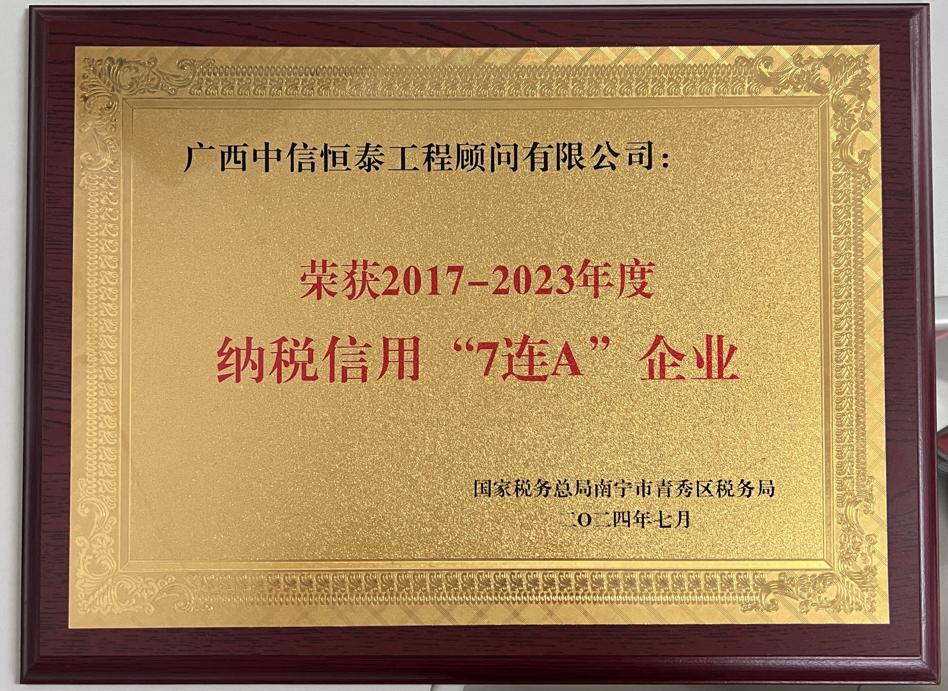 近日,中信恒泰憑借誠信納稅的良好信譽(yù),榮獲由國家稅務(wù)總局南寧市青秀區(qū)稅務(wù)局頒發(fā)的《納稅信用“7連A企業(yè)”證書》,獲得2017-2023年度納稅信用“7連A企業(yè)”榮譽(yù)稱號。