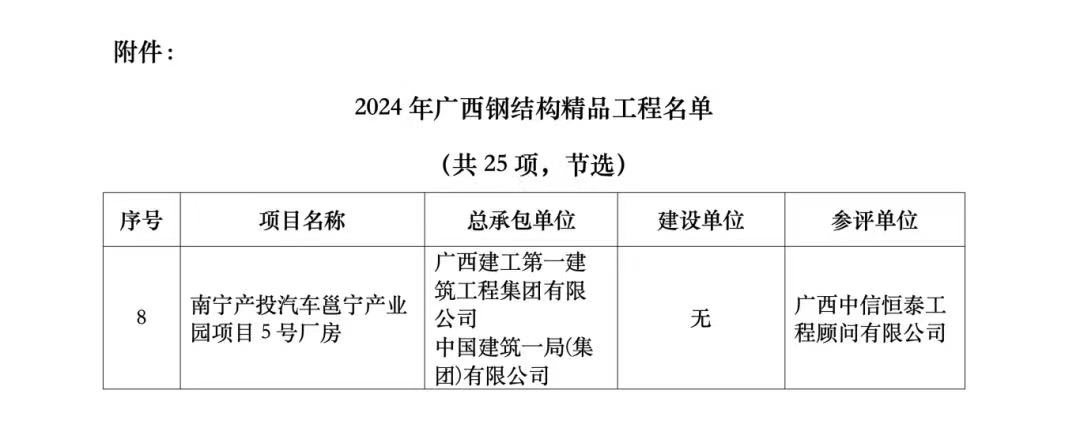 近日,廣西建筑業(yè)聯(lián)合會公布了2024年廣西鋼結(jié)構(gòu)精品工程名單,中信恒泰監(jiān)理的南寧產(chǎn)投汽車邕寧產(chǎn)業(yè)園項目5號廠房項目在眾多參評項目中脫穎而出,成為全區(qū)25項獲此殊榮的工程之一。