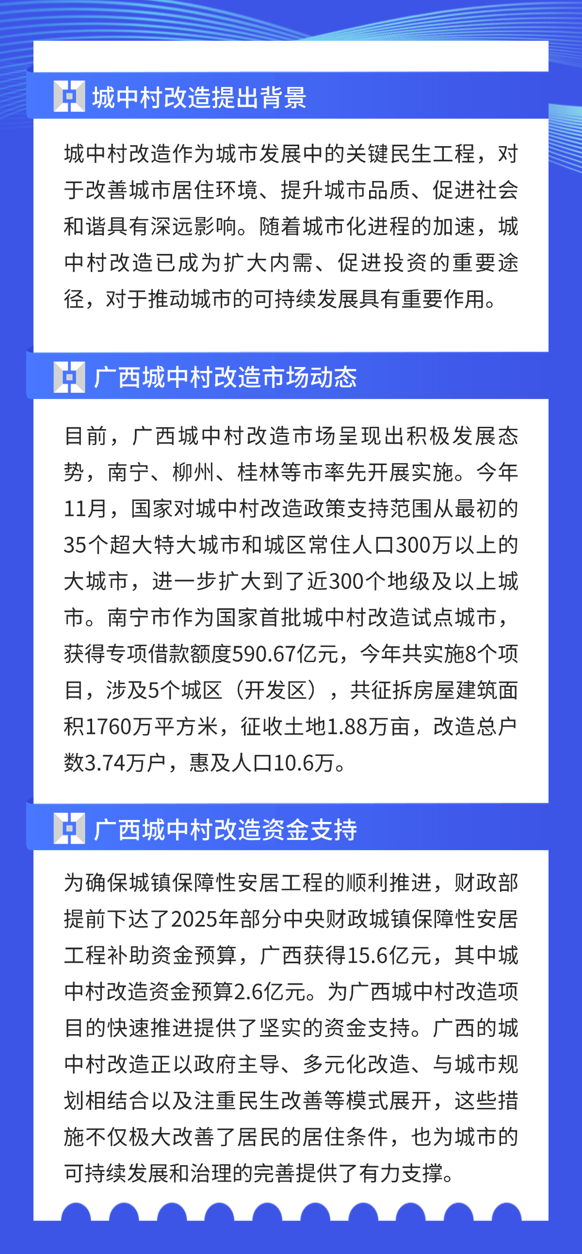 城中村改造是解決群眾急難愁盼問題的重大民生工程,項目建成后將有效改善居民的居住環(huán)境和生活品質(zhì),增強居民的幸福感與歸屬感。通過引入現(xiàn)代化的設(shè)計理念與人性化的空間布局,打造功能完善、宜居宜業(yè)的新型社區(qū),為廣西乃至全國的城中村改造項目提供實踐參考,積累并分享寶貴經(jīng)驗。