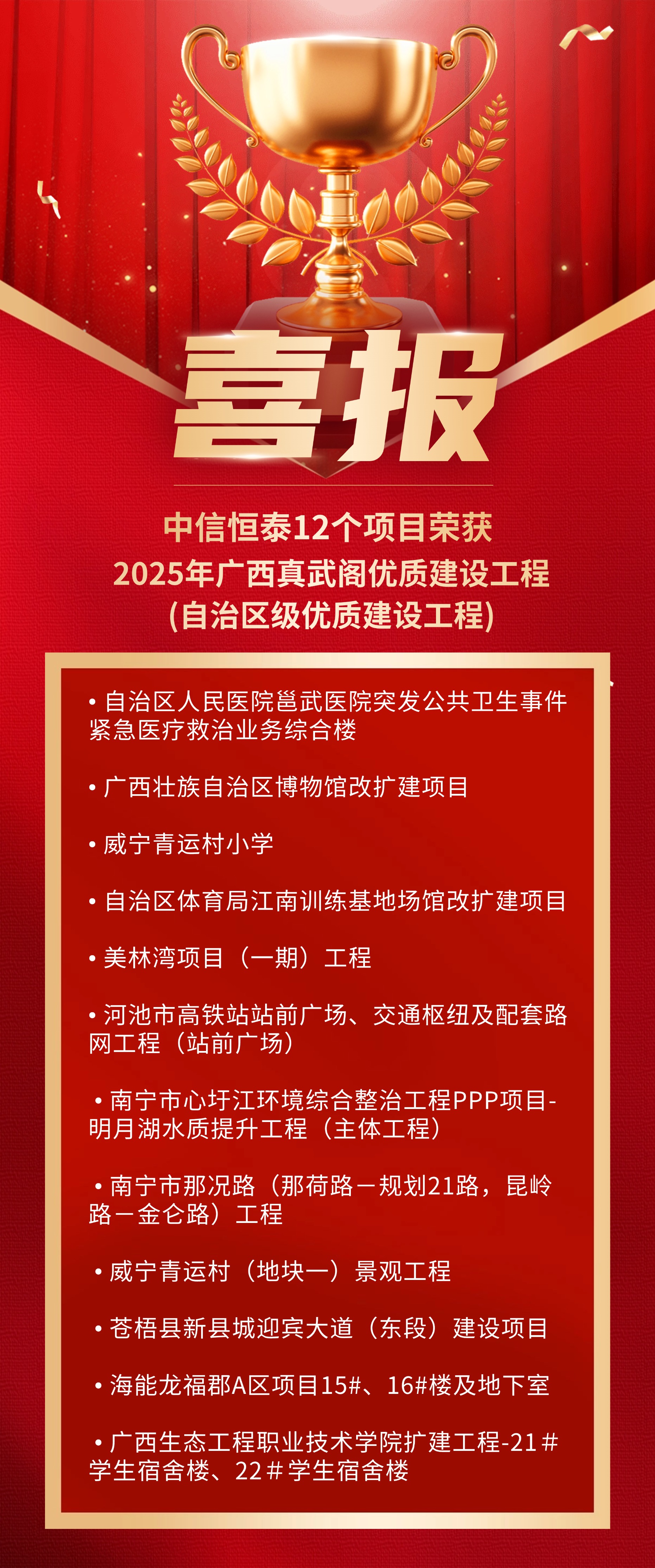 近日,廣西建筑業(yè)聯(lián)合會正式發(fā)布《關(guān)于公布2025年廣西真武閣優(yōu)質(zhì)建設(shè)工程(自治區(qū)級優(yōu)質(zhì)建設(shè)工程)名單的通知》,中信恒泰監(jiān)理的12個項目榜上有名,充分彰顯了集團在工程質(zhì)量管控、技術(shù)創(chuàng)新應(yīng)用等方面的綜合實力,為推動廣西建筑業(yè)高質(zhì)量發(fā)展注入強勁動能。 項目名稱:自治區(qū)人民醫(yī)院邕武醫(yī)院突發(fā)公共衛(wèi)生事件緊急醫(yī)療救治業(yè)務(wù)綜合樓 項目總師:謝維鈞 項目總監(jiān):蘇林 項目名稱:廣西壯族自治區(qū)博物館改擴建項目 項目名稱:威寧青運村小學(xué) 項目總監(jiān):盧明光 項目名稱:自治區(qū)體育局江南訓(xùn)練基地場館改擴建項目 項目總監(jiān):曾德政 項目名稱:美林灣項目(一期)工程 項目總監(jiān):香輝 項目名稱:河池市高鐵站站前廣場、交通樞紐及配套路網(wǎng)工程(站前廣場) 項目總監(jiān):鄭東和 項目名稱:南寧市心圩江環(huán)境綜合整治工程PPP項目-明月湖水質(zhì)提升工程(主體工程) 項目名稱:南寧市那況路(那荷路-規(guī)劃21路,昆嶺路-金侖路)工程 項目總監(jiān):唐銎 項目名稱:威寧青運村(地塊一)景觀工程 項目總監(jiān):盧明光 項目名稱:蒼梧縣新縣城迎賓大道(東段)建設(shè)項目 項目總監(jiān):經(jīng)明漢 項目名稱:海能龍福郡A區(qū)項目15#、16#樓及地下室 項目總監(jiān):石志 項目名稱:廣西生態(tài)工程職業(yè)技術(shù)學(xué)院擴建工程-21#學(xué)生宿舍樓、22#學(xué)生宿舍樓 腳踏實地行穩(wěn)路,久久為功筑匠心。中信恒泰集團將以此次獲獎為新起點,繼續(xù)秉持“務(wù)實篤行、精進創(chuàng)新”的作風(fēng),扎根廣西建設(shè)一線,充分發(fā)揚工匠精神,不斷提升工程管理水平和服務(wù)質(zhì)量,為推動廣西建筑業(yè)高質(zhì)量發(fā)展作出更大貢獻。