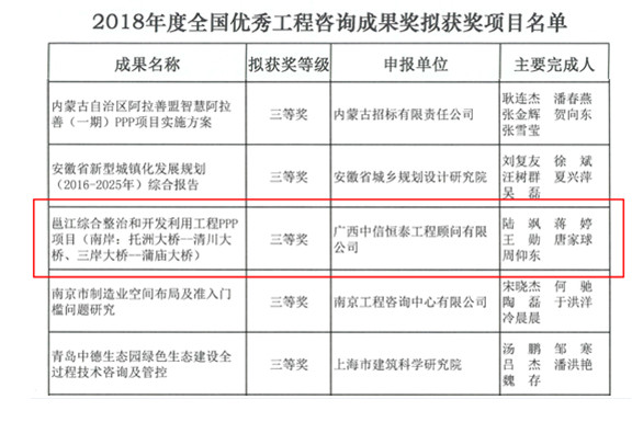 辭舊迎新之際喜訊傳來,2018年度全國優(yōu)秀工程咨詢成果獎獲獎名單近日揭曉,廣西PPP咨詢行業(yè)獲此殊榮2項(xiàng),分別為三等獎和優(yōu)秀獎,其中由廣西中信恒泰工程顧問有限公司完成的《邕江綜合整治和開發(fā)利用工程PPP項(xiàng)目(南岸:托洲大橋—清川大橋、三岸大橋—蒲廟大橋)》成果榮獲“2018年度全國優(yōu)秀工程咨詢成果獎”三等獎。這不僅是自2016年P(guān)PP項(xiàng)目咨詢成果參與該獎項(xiàng)評獎以來,中信恒泰首次獲此殊榮,更是目前廣西PPP項(xiàng)目咨詢成果獲得的最高榮譽(yù)!