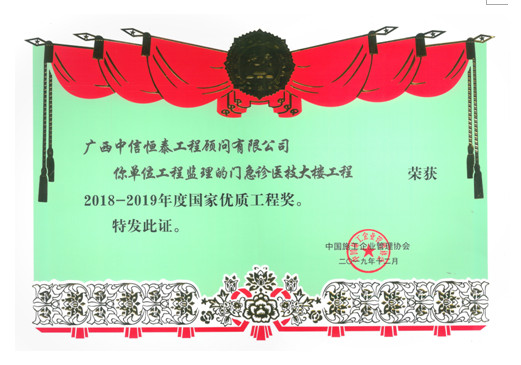2019年國(guó)家優(yōu)質(zhì)工程獎(jiǎng)總結(jié)表彰大會(huì)于12月8日在國(guó)家會(huì)議中心舉行。會(huì)議對(duì)榮獲2018-2019年度國(guó)家優(yōu)質(zhì)工程獎(jiǎng)項(xiàng)目進(jìn)行表彰,廣西中信恒泰工程顧問有限公司監(jiān)理的項(xiàng)目再獲三項(xiàng)國(guó)優(yōu)大獎(jiǎng),分別為方特東盟神話景觀工程、廣西大學(xué)圖書館二期工程、門急診醫(yī)技大樓工程。截止目前,中信恒泰共有9項(xiàng)工程獲得此項(xiàng)殊榮。