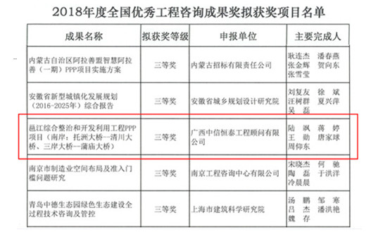 2018年度全國(guó)優(yōu)秀工程咨詢成果獎(jiǎng)獲獎(jiǎng)名單近日揭曉,廣西PPP咨詢行業(yè)獲此殊榮2項(xiàng),其中由廣西中信恒泰工程顧問有限公司完成的《邕江綜合整治和開發(fā)利用工程PPP項(xiàng)目(南岸:托洲大橋—清川大橋、三岸大橋—蒲廟大橋)》成果榮獲“2018年度全國(guó)優(yōu)秀工程咨詢成果獎(jiǎng)”三等獎(jiǎng)。這不僅是自2016年P(guān)PP項(xiàng)目咨詢成果參與該獎(jiǎng)項(xiàng)評(píng)獎(jiǎng)以來,中信恒泰首次獲此殊榮,更是目前廣西PPP項(xiàng)目咨詢成果獲得的最高榮譽(yù)!