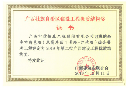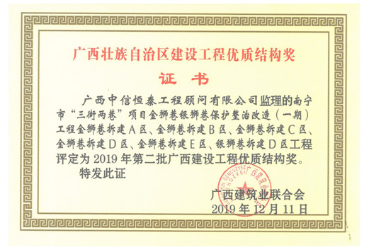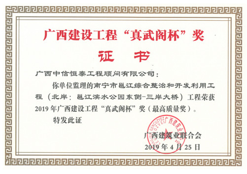由廣西建筑業(yè)聯(lián)合會(huì)組織評(píng)選的2019年廣西建設(shè)工程“真武閣杯”獎(jiǎng)(最高質(zhì)量獎(jiǎng))和2019年廣西建設(shè)工程優(yōu)質(zhì)結(jié)構(gòu)獎(jiǎng),廣西中信恒泰工程顧問有限公司監(jiān)理的南寧國(guó)際會(huì)展中心改擴(kuò)建工程配套設(shè)施項(xiàng)目(1#、2#、3#地塊)項(xiàng)目、南寧市邕江綜合整治和開發(fā)利用工程(北岸:邕江濱水公園東側(cè)-三岸大橋)等12個(gè)項(xiàng)目榮獲2019年廣西建設(shè)工程“真武閣杯”獎(jiǎng)。
