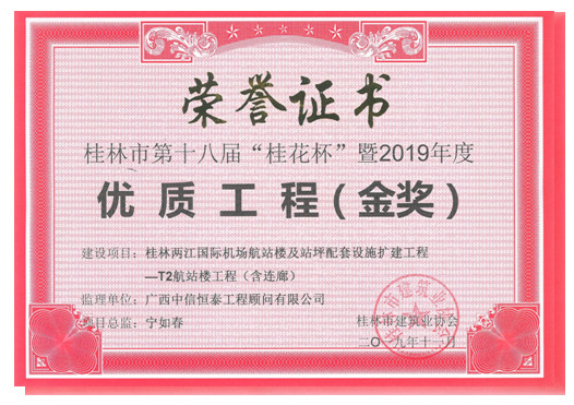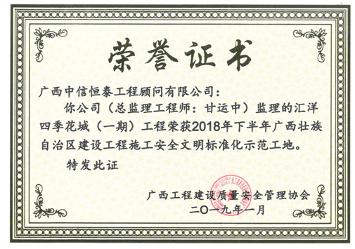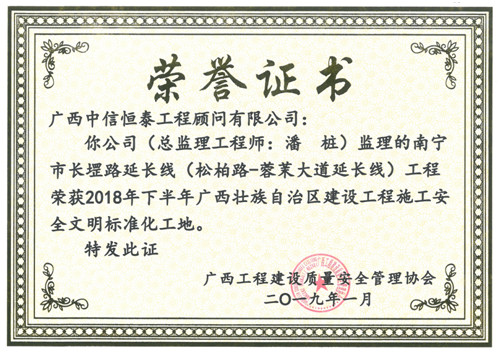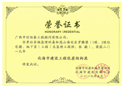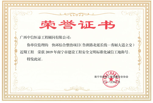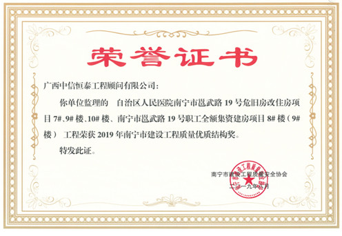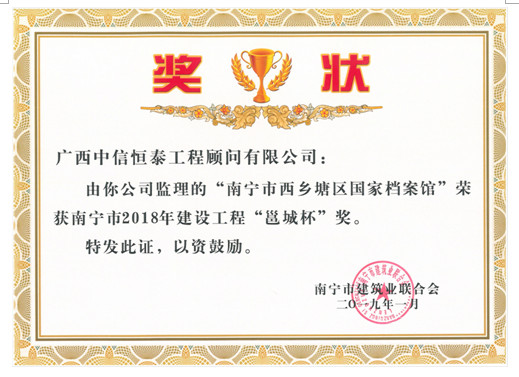 2019年,中信恒泰獲得眾多榮譽(yù)獎(jiǎng)項(xiàng): 2018年南寧市建設(shè)工程“邕城杯”獎(jiǎng)、2018年玉林市建設(shè)工程“萬花樓杯”獎(jiǎng)、2019年北海市“珠城杯”獎(jiǎng)、桂林市第十八屆“桂花杯”暨2019年度優(yōu)質(zhì)工程(金獎(jiǎng))、柳州市第二十九屆建設(shè)工程質(zhì)量“龍城杯”獎(jiǎng)、2019年防城港市優(yōu)質(zhì)工程獎(jiǎng)等20項(xiàng)市級(jí)優(yōu)質(zhì)工程獎(jiǎng)、38項(xiàng)各地市的安全文明工地、16項(xiàng)市級(jí)優(yōu)質(zhì)結(jié)構(gòu)獎(jiǎng)。