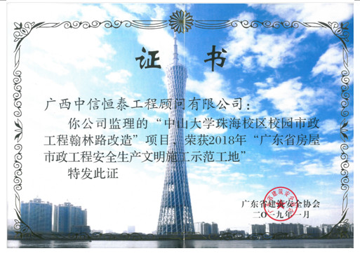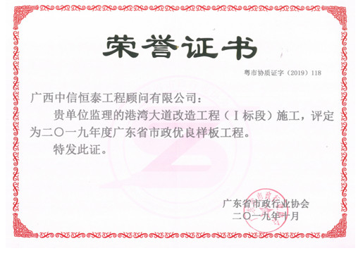 中信恒泰省外分公司在建項(xiàng)目也獲得了省級(jí)質(zhì)量安全獎(jiǎng)榮譽(yù)。港灣大道改造(I標(biāo)段)工程榮獲“2019年度廣東省市政優(yōu)良樣板工程”稱號(hào);機(jī)場(chǎng)西路至青灣連接線工程、中山大學(xué)珠海校區(qū)校園市政工程翰林路改造工程2個(gè)項(xiàng)目榮獲2018年“廣東省房屋市政工程安全生產(chǎn)文明施工示范工地”稱號(hào)。