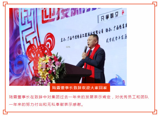 中信恒泰集團(tuán)董事長陸霖,集團(tuán)下屬公司高管、區(qū)內(nèi)外分公司及全體職能事業(yè)中心員工參加新春團(tuán)拜會(huì)。