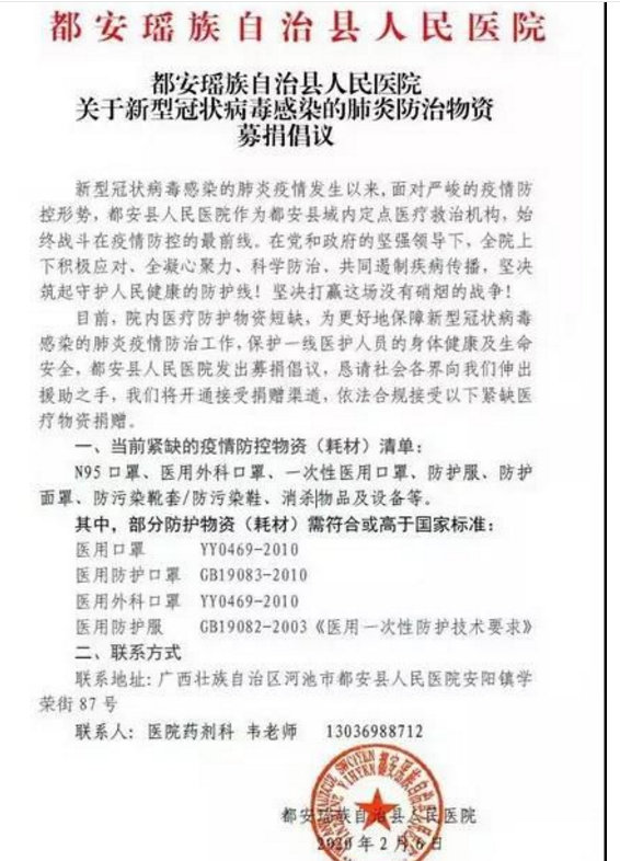 面對(duì)嚴(yán)峻的疫情防控形勢,為更好地保障新型冠狀病毒感染的肺炎疫情防治工作,保護(hù)一線醫(yī)護(hù)人員的身體健康及生命安全,都安縣人民醫(yī)院向社會(huì)發(fā)出募捐倡議。