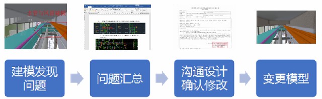 在BIM建模過(guò)程中,發(fā)現(xiàn)圖紙標(biāo)注不明、設(shè)計(jì)沖突等問(wèn)題,需將問(wèn)題登記在碰撞報(bào)告中,并將問(wèn)題匯總,而后與設(shè)計(jì)方溝通確認(rèn),并在現(xiàn)場(chǎng)施工前提前與設(shè)計(jì)溝通并確定最終做法,減少返工。