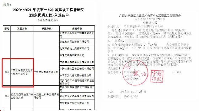 近日,中國建筑業(yè)協(xié)會公示了《2020~2021年度第一批中國建設(shè)工程魯班獎(國家優(yōu)質(zhì)工程)入選名單》,由廣西中信恒泰工程顧問有限公司進行施工階段全過程監(jiān)理的廣西大學(xué)君武文化藝術(shù)教育中心項目榮獲魯班獎,再次見證中信恒泰公司監(jiān)理業(yè)務(wù)的高質(zhì)量發(fā)展。