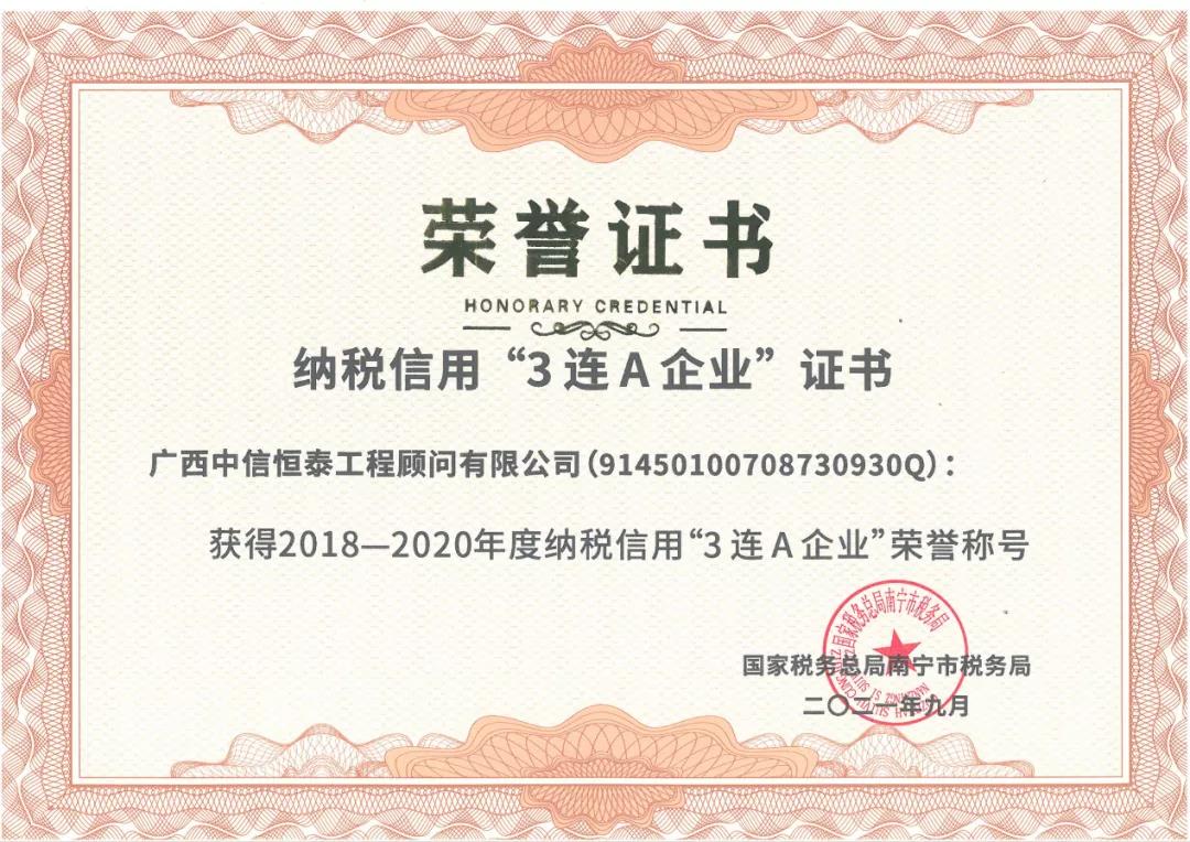 近日,中信恒泰公司憑借誠(chéng)信納稅的良好信譽(yù),2018-2020年度連續(xù)三年納稅信用等級(jí)為A級(jí),榮獲由國(guó)家稅務(wù)總局南寧市稅務(wù)局頒發(fā)的《納稅信用“3連A企業(yè)”證書》,獲得2018-2020年度納稅信用“3連A企業(yè)”榮譽(yù)稱號(hào)。