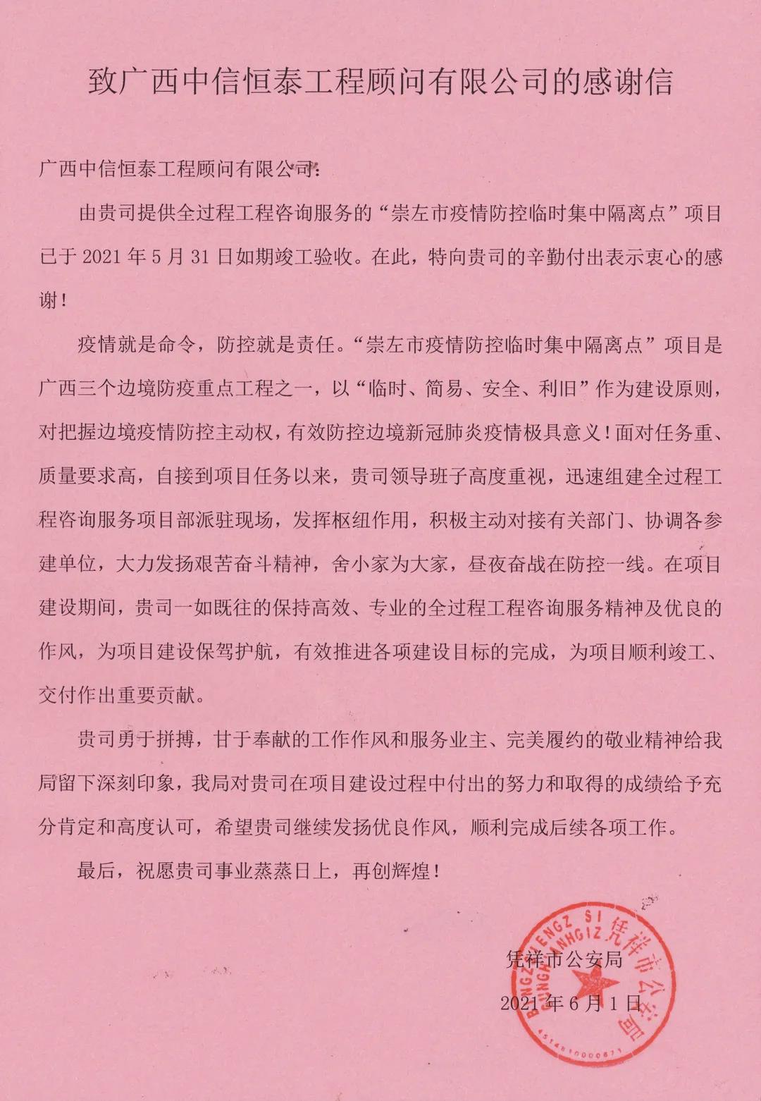 近日,憑祥市公安局發(fā)來感謝信,對(duì)中信恒泰僅用12天圓滿完成崇左隔離點(diǎn)項(xiàng)目表示感謝;對(duì)中信恒泰全咨團(tuán)隊(duì)艱苦奮斗、晝夜奮戰(zhàn),高效、專業(yè)的服務(wù)精神表示高度贊賞。