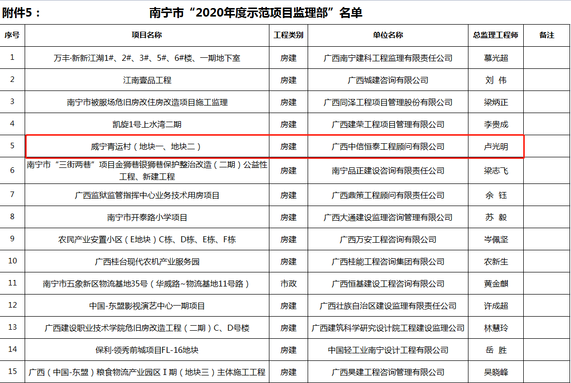 中信恒泰監(jiān)理項(xiàng)目威寧青運(yùn)村(地塊一、地塊二)工程獲評(píng)南寧市“2020年度示范項(xiàng)目監(jiān)理部”稱號(hào)