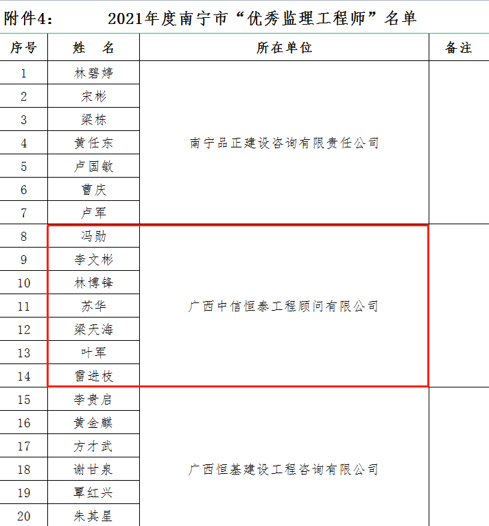 中信恒泰員工獲評(píng)2021年度南寧市“優(yōu)秀監(jiān)理工程師”