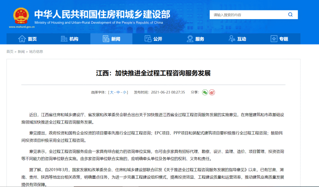 近日,江西省住房和城鄉(xiāng)建設(shè)廳、省發(fā)展和改革委員會聯(lián)合出臺關(guān)于加快推進江西省全過程工程咨詢服務發(fā)展的實施意見,在房屋建筑和市政基礎(chǔ)設(shè)施領(lǐng)域加快推進全過程工程咨詢服務發(fā)展。