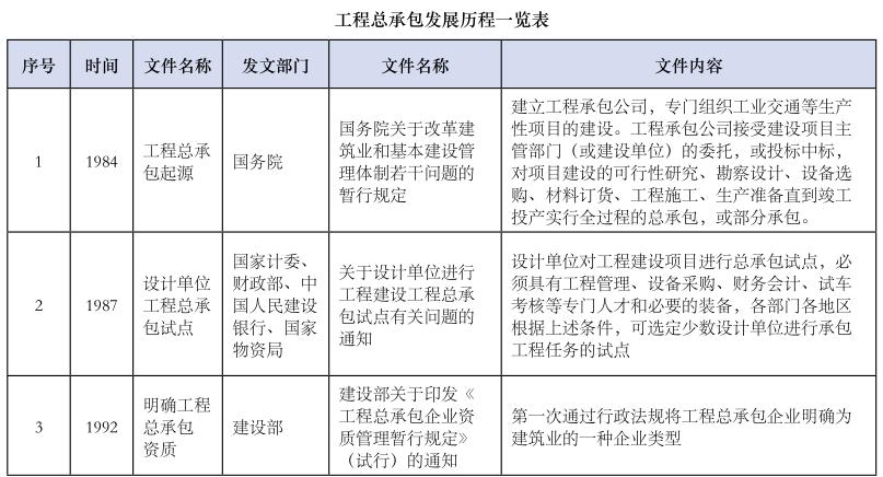2016年隨著住建部發(fā)布《住房城鄉(xiāng)建設(shè)部關(guān)于進(jìn)一步推進(jìn)工程總承包發(fā)展的若干意見》:“深化建設(shè)項(xiàng)目組織實(shí)施方式改 革,推廣工程總承包制,提升工程建設(shè)質(zhì)量和效益,大力推進(jìn)工程總承包,有利于提升項(xiàng)目可行性研究和初步設(shè)計(jì)深度,實(shí)現(xiàn)設(shè)計(jì)、采購、施工等各階段工作的深度融合,提高工程建設(shè)水平”的提出,工程總承包逐步在房屋建筑和市政領(lǐng)域全面展開,工程總承包進(jìn)入了一個(gè)快速發(fā)展期,工程總承包發(fā)展歷程詳下表:
