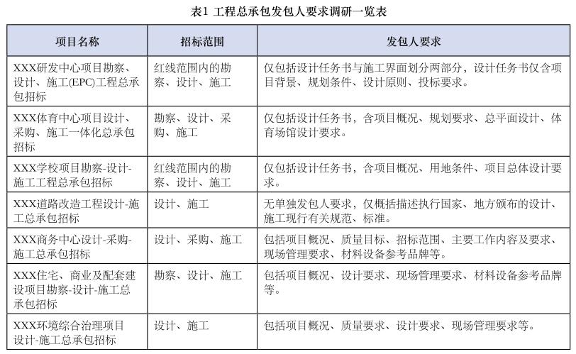 從上表可以看出,目前市場上的工程總承包發(fā)包人要求集中在項(xiàng)目概況、設(shè)計(jì)任務(wù)書、施工界面、現(xiàn)場管理要求、材料設(shè)備參考品牌中的兩項(xiàng)或幾項(xiàng)的組合,很明顯這與工程總承包對于發(fā)包人要求的內(nèi)容差異很大。