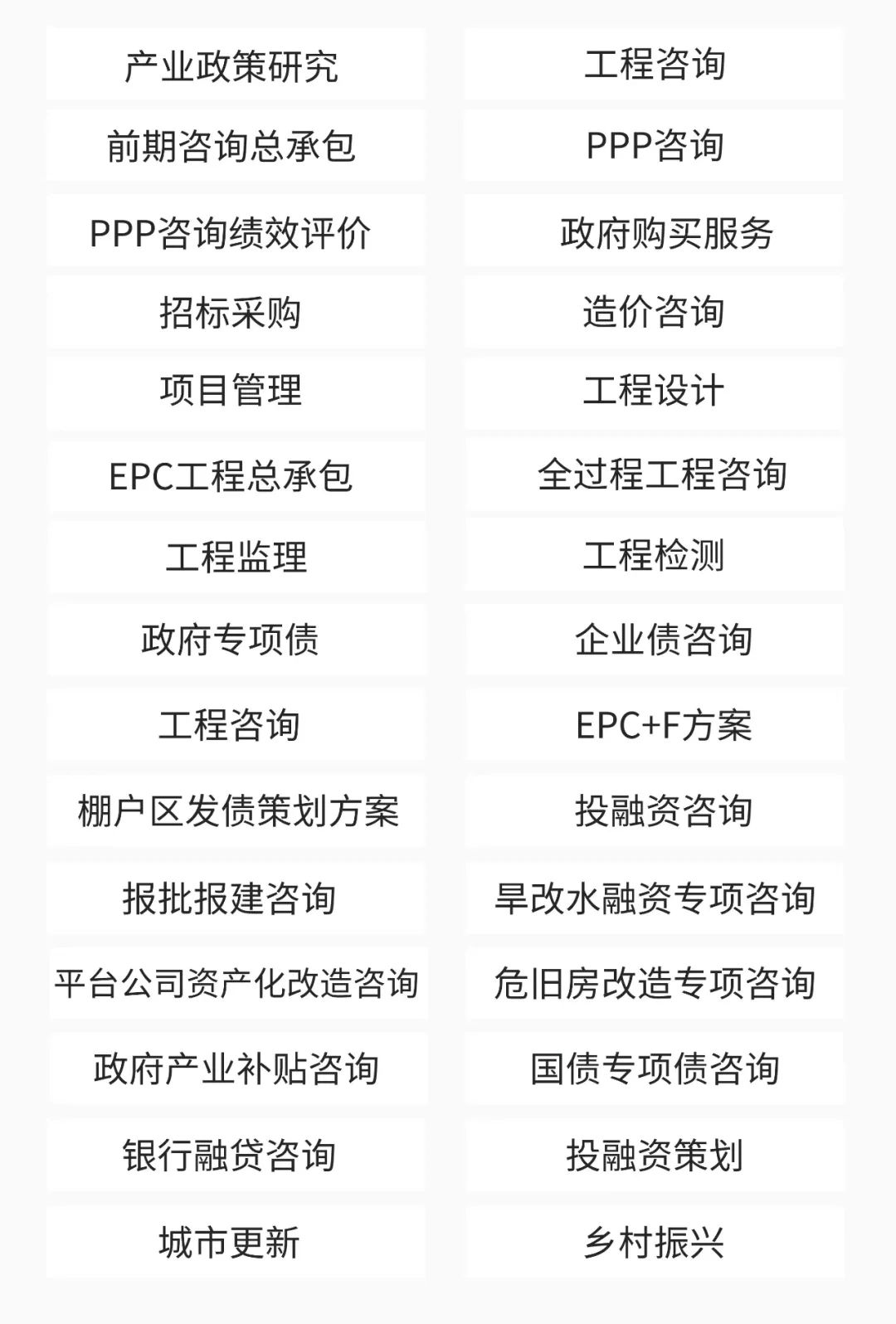 ◆ 完整的建筑業(yè)產(chǎn)業(yè)鏈包括項目全生命周期內(nèi)的投資機會分析、策劃咨詢、工程咨詢(前期咨詢總承包)、產(chǎn)業(yè)政策研究、投融資咨詢(政府產(chǎn)業(yè)補貼咨詢、國債專項債咨詢和銀行融貸咨詢)、平臺資產(chǎn)化改造和信用評價提升、全過程工程咨詢、PPP咨詢、PPP績效評價、工程設(shè)計、招標(biāo)代理、造價咨詢、工程監(jiān)理、工程檢測、政府購買服務(wù)、EPC工程總承包、BIM技術(shù)咨詢、無人機技術(shù)及運營維護等各項業(yè)務(wù)。