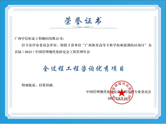 喜訊 |?中信恒泰“廣西體育高等??茖W校相思湖校區(qū)項目”榮獲首屆中國管理現(xiàn)代化研究會工程管理年會全過程工程咨詢優(yōu)秀項目