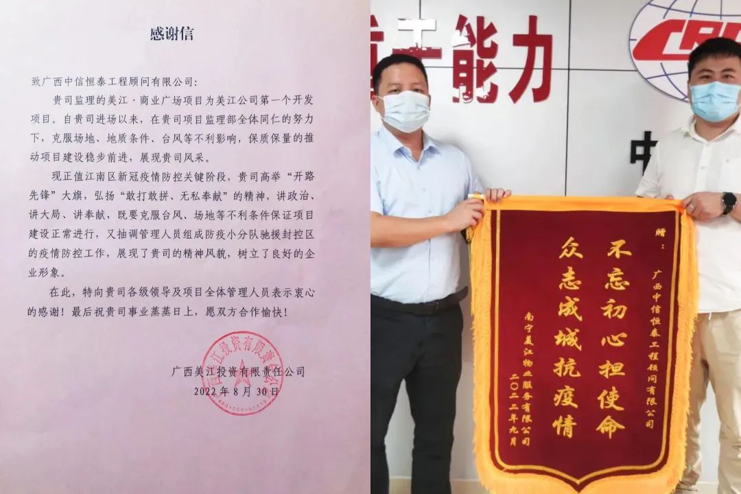 近日,廣西中信恒泰工程顧問有限公司收到了來自廣西美江投資有限責任公司發(fā)來的錦旗和感謝信,對中信恒泰美江·商業(yè)廣場項目監(jiān)理部全體人員出色的工作成績及疫情防控工作給予了充分的肯定和高度贊譽。