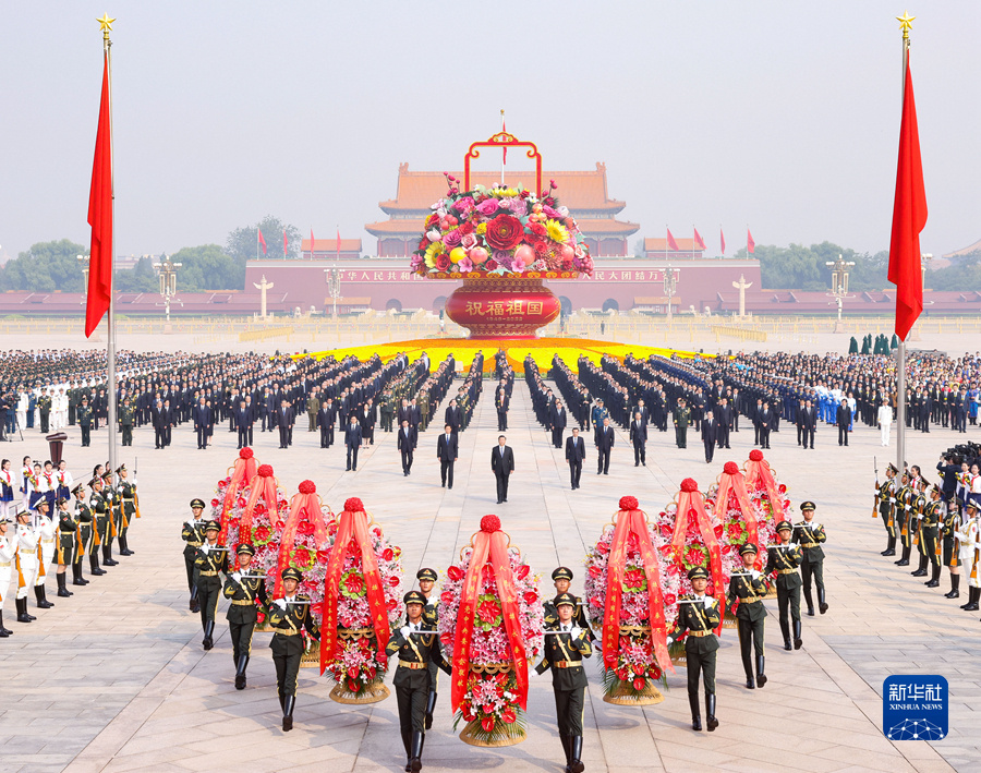 10時(shí)整,向人民英雄敬獻(xiàn)花籃儀式開始。軍樂團(tuán)奏響《義勇軍進(jìn)行曲》,全場齊聲高唱中華人民共和國國歌。
