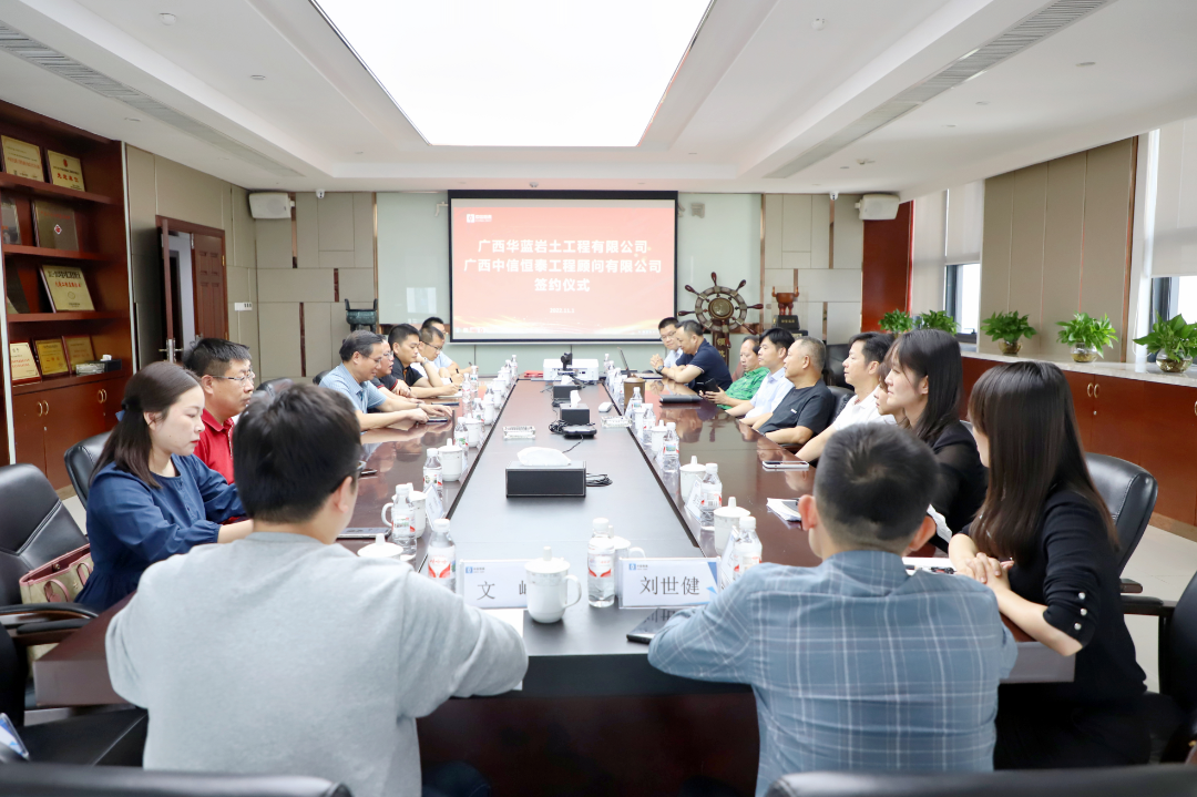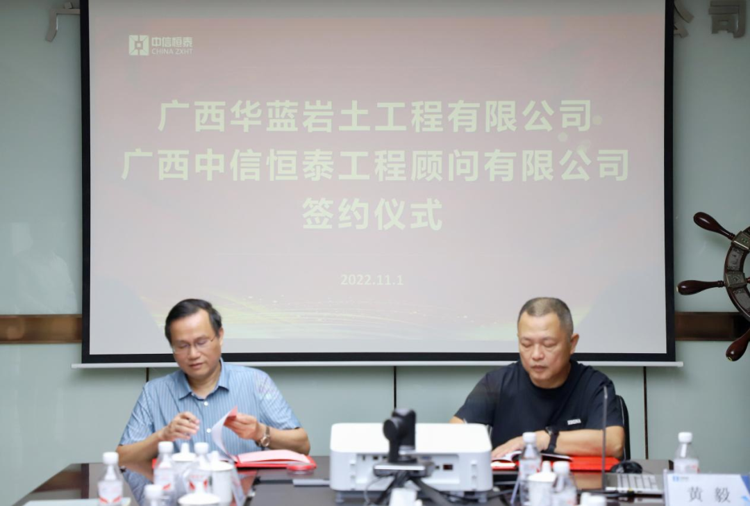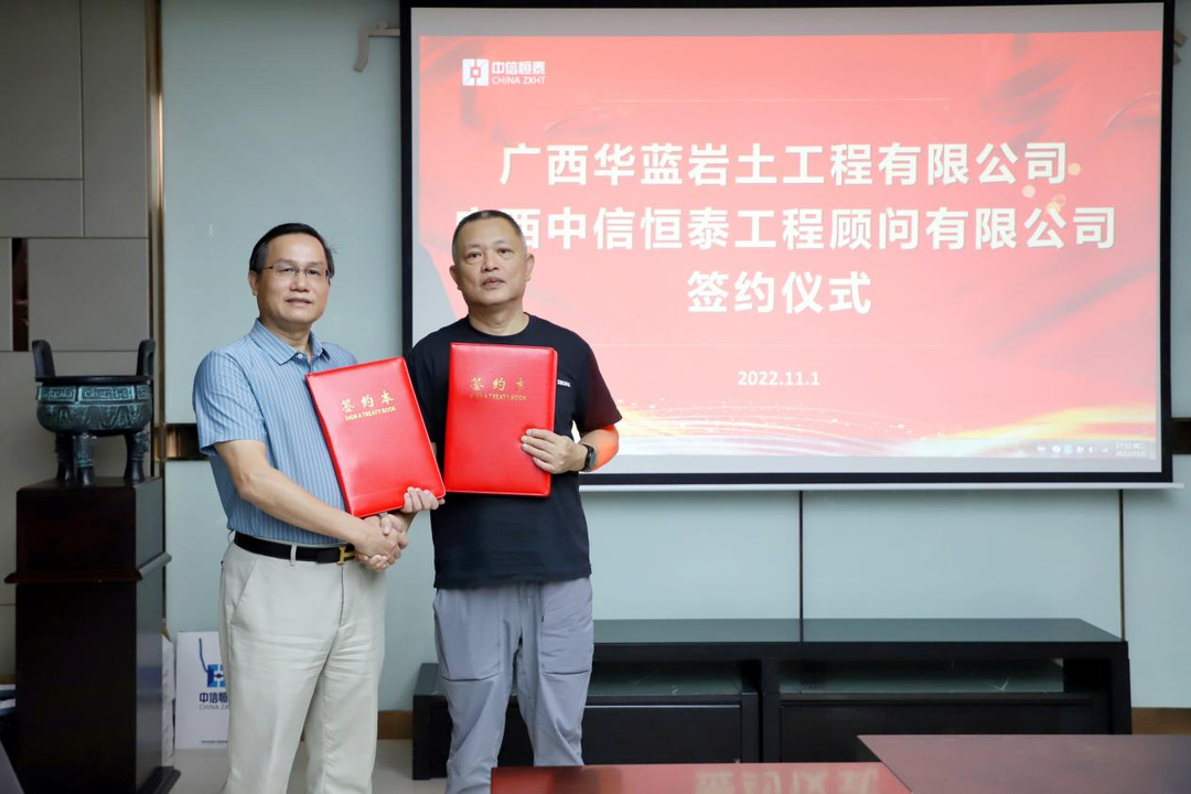 11月1日下午,中信恒泰與廣西華藍(lán)巖土工程有限公司戰(zhàn)略合作簽約儀式圓滿舉行。中信恒泰集團(tuán)董事長(zhǎng)陸霖、總經(jīng)理周仰東,副總經(jīng)理唐家球、陸颯、郭佳鑫、梁漢吉,廣西華藍(lán)巖土工程有限公司董事長(zhǎng)盧玉南、副總經(jīng)理陸韋春出席簽約儀式。中信恒泰集團(tuán)技術(shù)委員會(huì)主任,集團(tuán)工程管理研究院院長(zhǎng)任坤、全過程咨詢技術(shù)總監(jiān)黃毅、經(jīng)營中心經(jīng)理劉世健等相關(guān)部門負(fù)責(zé)人,廣西華藍(lán)巖土工程有限公司市場(chǎng)總監(jiān)、地質(zhì)災(zāi)害防治中心主任蔣受義,總經(jīng)理助理、工程咨詢中心主任李新,運(yùn)營管理部部長(zhǎng)龐倩,勘察設(shè)計(jì)六所所長(zhǎng)陳盛金,測(cè)繪地理信息中心主任楊錫旺,工程咨詢中心副主任潘正潮等相關(guān)部門負(fù)責(zé)人共同參加簽約。