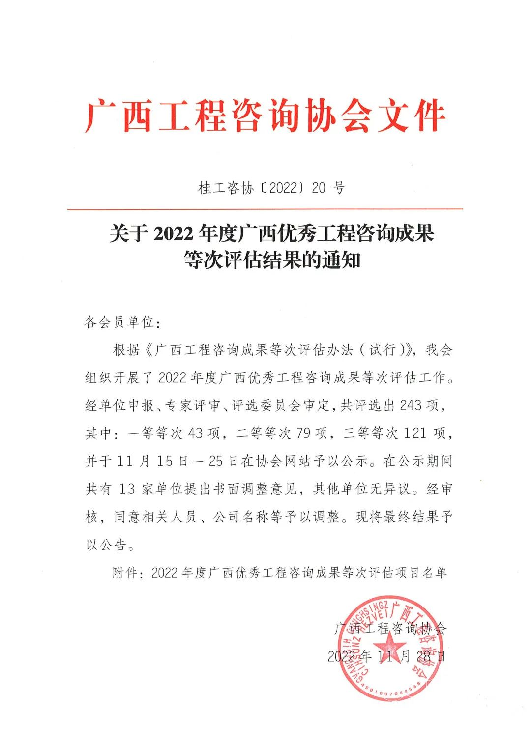 2022年11月,廣西工程咨詢協(xié)會正式公布了關于2022年度廣西優(yōu)秀工程咨詢成果獎獲獎項目名單,經(jīng)協(xié)會專家評審、評選委員會審定,中信恒泰3項咨詢成果榜上有名。