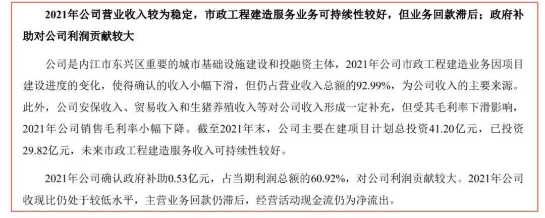 上圖為某公司在中國(guó)貨幣網(wǎng)披露的債券跟蹤評(píng)級(jí)報(bào)告,報(bào)告中除財(cái)務(wù)會(huì)計(jì)報(bào)告外,還披露了市政工程建造服務(wù)業(yè)務(wù)回款滯后,政府補(bǔ)助對(duì)公司利潤(rùn)貢獻(xiàn)較大的情況,實(shí)際上,即便合同中并未約定“背對(duì)背條款”,但基礎(chǔ)設(shè)施項(xiàng)目回款與業(yè)主業(yè)務(wù)回款和國(guó)家投資落實(shí)情況仍息息相關(guān),業(yè)主回款滯后往往導(dǎo)致承包人亦回款困難,可能造成一定的墊資壓力。