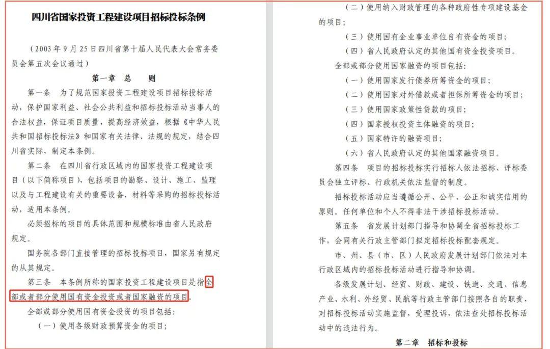 2003年9月25日發(fā)布的《四川省國(guó)家投資工程建設(shè)項(xiàng)目招標(biāo)投標(biāo)條例》第三條對(duì)“國(guó)家投資”的定義和形式進(jìn)行了詳細(xì)規(guī)定:國(guó)家投資工程建設(shè)項(xiàng)目是指全部或者部分使用國(guó)有資金投資或者國(guó)家融資的項(xiàng)目。