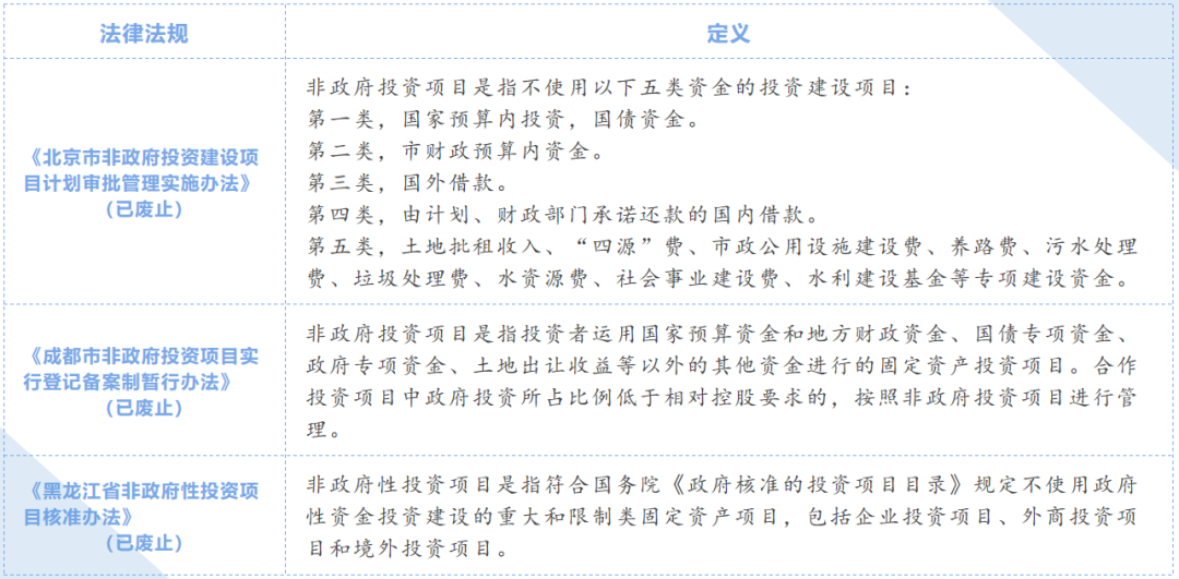 現(xiàn)行有效的法律法規(guī)并未對(duì)“非政府投資”作出相關(guān)文義解釋,從已廢止的《北京市非政府投資建設(shè)項(xiàng)目計(jì)劃審批管理實(shí)施辦法》《成都市非政府投資項(xiàng)目實(shí)行登記備案制暫行辦法》《黑龍江省非政府性投資項(xiàng)目核準(zhǔn)辦法》的規(guī)定來看,各地區(qū)對(duì)于非政府投資的解釋存在些許出入。