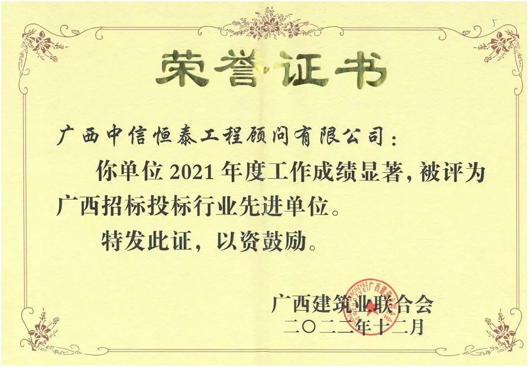 中信恒泰已連續(xù)12年獲得廣西招標(biāo)投標(biāo)行業(yè)先進(jìn)單位榮譽(yù)稱號(hào),本次獲獎(jiǎng)充分展示了公司作為行業(yè)領(lǐng)軍企業(yè)在招投標(biāo)領(lǐng)域的雄厚實(shí)力和良好口碑。