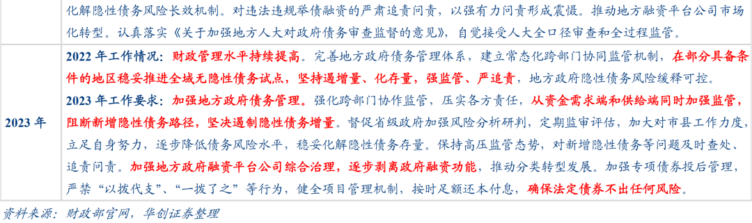1、提法上有何不同?3年疫后再次重提防范化解地方政府債務(wù)風(fēng)險(xiǎn)。繼2020年以來,今年首次在工作部署中強(qiáng)調(diào)防范化解地方政府債務(wù)風(fēng)險(xiǎn),反映出當(dāng)前中央層面高度重視地方政府債務(wù)風(fēng)險(xiǎn)。從歷年兩會政府工作報(bào)告來看,上次在工作部署中出現(xiàn)地方政府債務(wù)風(fēng)險(xiǎn)表述的時間為2019年,具體表述為“防范化解重大風(fēng)險(xiǎn)要強(qiáng)化底線思維,穩(wěn)妥處理地方政府債務(wù)風(fēng)險(xiǎn)”,當(dāng)時背景為2018年全國范圍內(nèi)隱性債務(wù)摸底完成后,中央對防范化解地方政府債務(wù)風(fēng)險(xiǎn)的重心為遏制隱性債務(wù)增量,穩(wěn)妥化解隱性債務(wù)存量。時隔四年后,在政府人員換屆背景下,當(dāng)前表述為“有效防范化解重大經(jīng)濟(jì)金融風(fēng)險(xiǎn),防范化解地方政府債務(wù)風(fēng)險(xiǎn)”,提法由“穩(wěn)妥處理”變?yōu)椤胺婪痘狻?,表述更加直接,防范化解地方政府債?wù)風(fēng)險(xiǎn)的重要性進(jìn)一步提升;